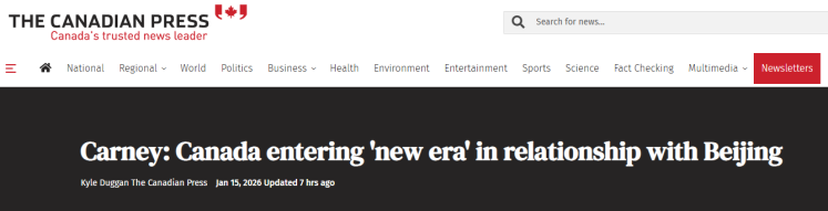 加拿大通讯社的报道注意到,卡尼在华期间表示,从能源到农业,从人文交流到多边主义,相关领域的合作将为两国人民带来巨大福祉。渥太华希望这次关系重启能成为“全球分裂与混乱时期合作共赢的典范”。